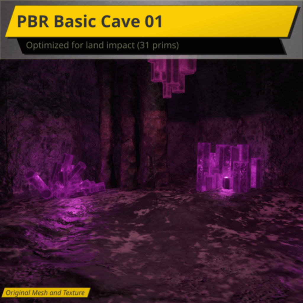 Includes a ground level and skybox version. Please see the in world demo for this mesh PBR cave with fallback textures as it's highly optimized for low land impact.