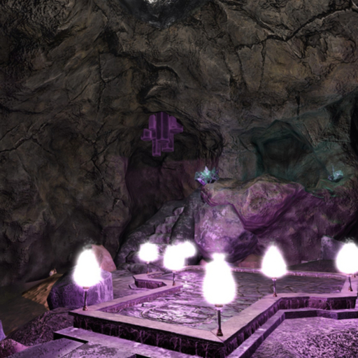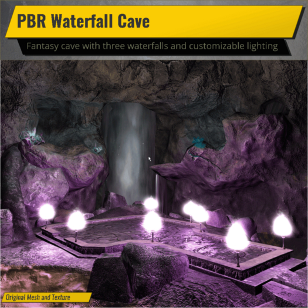 Mesh PBR cave featuring three waterfalls, torches, and crystals. Fantasy platform in the center for laying out furniture or whatever. Stairs leading to an additional platform. Calm pond water around the edges of the cave, with a small sandy beach for you to enjoy.