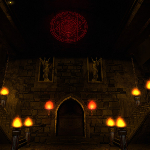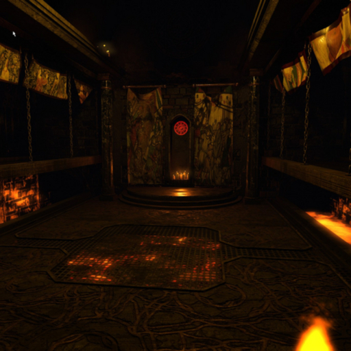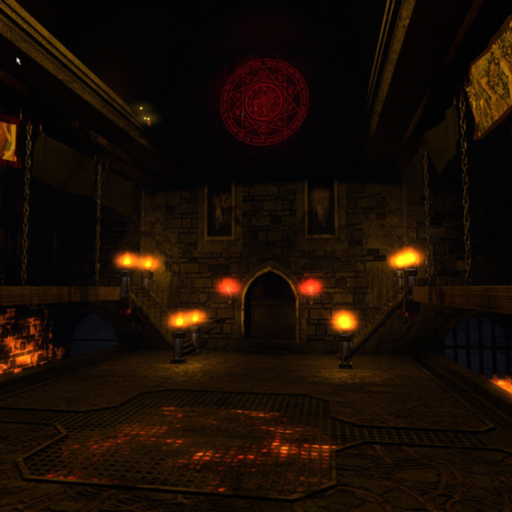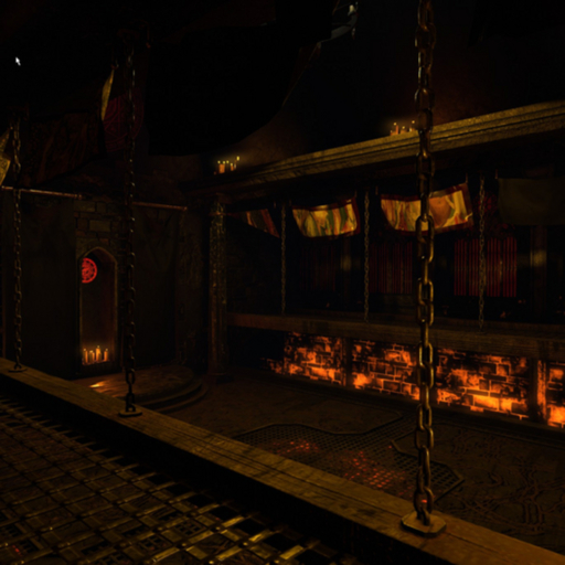 A medieval fantasy castle cave room, featuring a rectangular main area with elevated grated platforms along the sides. One entrance to the structure with doors. A fiery, lava, and evil theme.